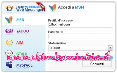 Come dice il mio amico Bimbominkia, questo programma è utile per accedere a messenger mentre si è a scuola, mentre si è a lavoro e in moltre altre occasioni. Oltre ad accedere con i dati di msn messenger potete accedere al programma con i vostri dati di yahoo messenger, aim, gtalk e molti altri. Non dovrete scaricare il programma ma vi basta immettere i dati e accedete direttamente online.