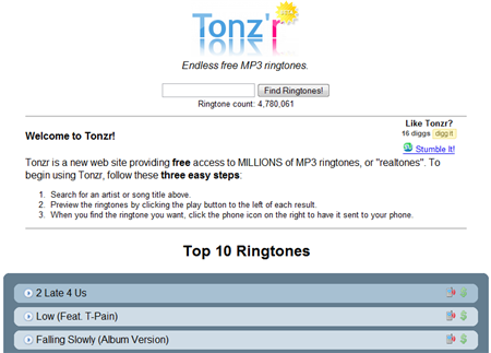 Tonzr: Scarica gratuitamente suonerie per il cellulare