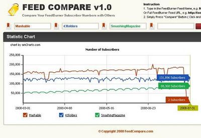 Feedcompare permette generare un grafico abbastanza dettagliato sull’andamento degli iscritti ad un particolare feed FeedBurner. Questa caratteristica ci permetterà di confrontare il nostro feed rss con quelli di altri siti per poi intraprendere le dovute conclusioni.