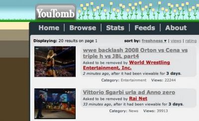 In un portale grande come Youtube ci sono migliaia di video che violano il copyright e che quindi vengono rimossi dopo un po’ di tempo dalla loro messa online. Per il grande numero di video rimossi, una scuola tedesca ha deciso di lanciare (mesi fa) il sito Youtomb. Questo servizio controlla tantissimi video di youtube e appena questi vengono rimossi, Youtomb pubblica il motivo per cui sono stati rimossi, da chi sono stati rimossi e per quanti tempo sono riusciti a stare online.