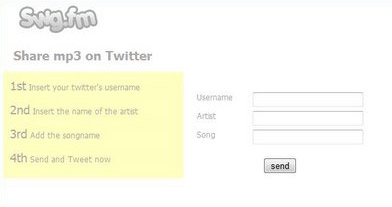 Swg.fm è un nuovo servizio web che vi permette di fare music sharing su Twitter. Diversamente da tutti gli altri servizi forniti da Twitter, quest’ultimo non richiede password di login ma solo il vostro username. Potrete immettere il vostro username , il nome dell’artista e il nome della canzone e cliccare il pulsante “send”. Swg.fm creerà i dettagli inerenti al brano scelto e all’artista.