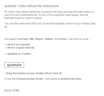 Una volta collegati a Quietube non dovrete far altro che trascinare il pulstante nella barra di navigazione, a questo punto non dovrete far altro che collegarvi a Youtube e per ogni video visualizzato cliccare sull’apposito bottone per guardarvelo con il nuovo assetto grafico.