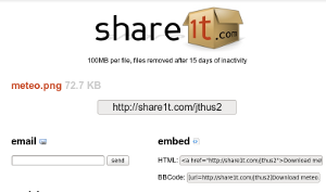 Avete necessità di condividere online file con i vostri amici e colleghi ma non sapete ancora come fare? Bene, allora questo servizio che sto per presentarvi fa proprio al caso vostro. Si tratta di Share1t (non più funzionante), uno strumento gratuito ed elementare che in pochi istanti riesce a far condividere con chi si desidera, documenti e file di una certa dimensione.