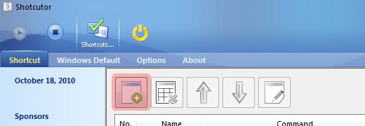 Per prima cosa, collegatevi all’homepage di Shortcutor e scaricate lì applicazione. Terminata questa procedura, potrete cliccare sull’icona presente nella barra delle applicazioni, proprio vicino all’orologio per avviare il programma. Per creare una combinazione di tasti di scelta rapida in Shortcutor basta cliccare il bottone “New” nella barra principale; a questo punto dovrete compilare i campi name, command, short cut per scegliere i tasti addetti ad avviare l’applicazione.