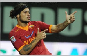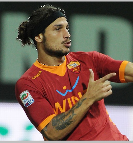 Scegliamo una fotografia, io ho scelto Osvaldo della Roma, apriamo Photoshop sblocchiamo il livello bloccato ( cliccando due volte sul lucchetto posto sul livello, poi si apre uno specchietto e basterà premere su ‘ok’) e selezioniamo il soggetto lasciando al di fuori la parte che vogliamo che esca dalla cornice, in questo modo :