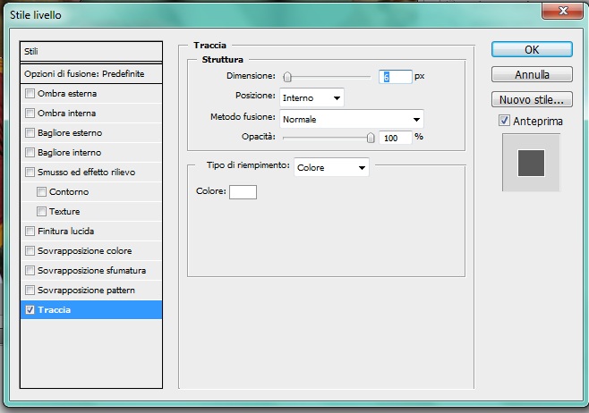 Successivamente, tenendo sempre selezionato la parte del soggetto (come la figura di sopra) andiamo in Modifica → Copia e poi clicchiamo nuovamente Modifica → incolla. Andiamo ora sul nuovo livello che si è creato e tenendolo selezionato andiamo in Livello → Stile Livello → Traccia. Settiamo i seguenti parametri nello specchietto che si aprirà :